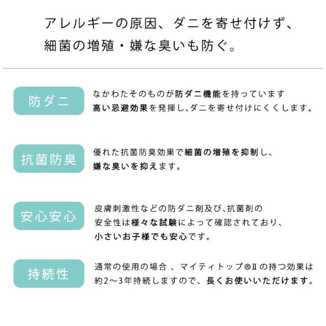 | テイジンの「マイティトップ®ⅡECO」を使用した敷き布団。 抗菌防臭防ダニ加工が施されているので、 アレルギーや衛生面が気になる方でも安心&快適。 軽量なので、取り扱いもラクラクです。 |