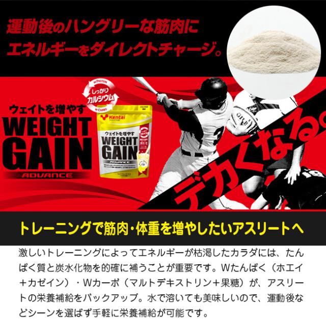 「Kentai(ケンタイ) ウェイトゲインアドバンス バナナラテ風味 360g」は、競技アスリートのカラダづくりを考えたプロテイン バナナ風味です。ダブルタンパク(ホエイ+カゼイン)、ダブルカーボ(果糖+マルトデキストリン)を配合。粉立ちの改善と水溶けのよさを実現し、手軽に栄養補給が可能です。アスリートの大きなカラダづくりを強力にサポートします。トレーニングで筋肉・体重を増やし、タフで強いカラダづくりを目指す方に。