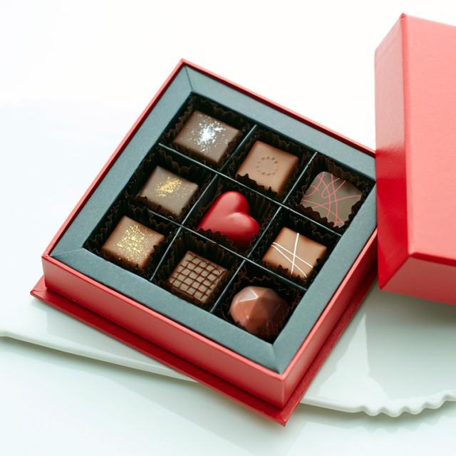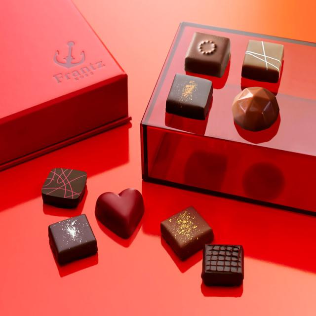 神戸フランツの贅沢ショコラ9個入りアソートセット。真っ赤なスクエア型の箱も高級感たっぷり。