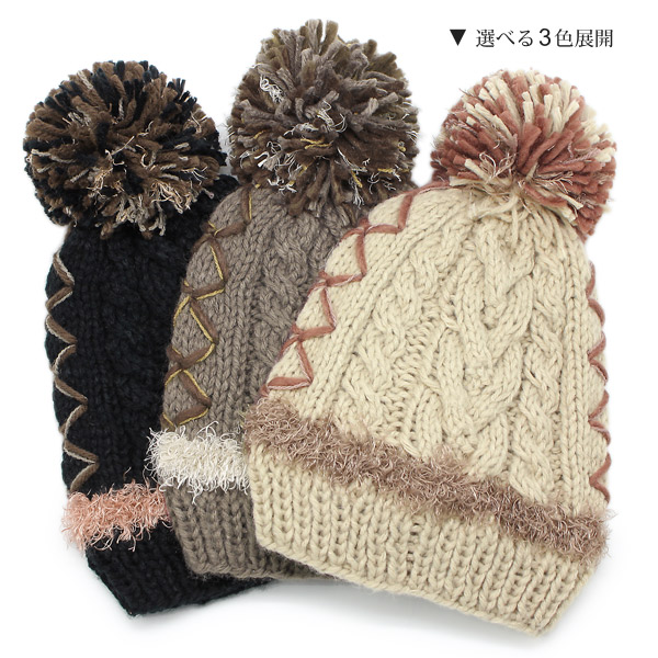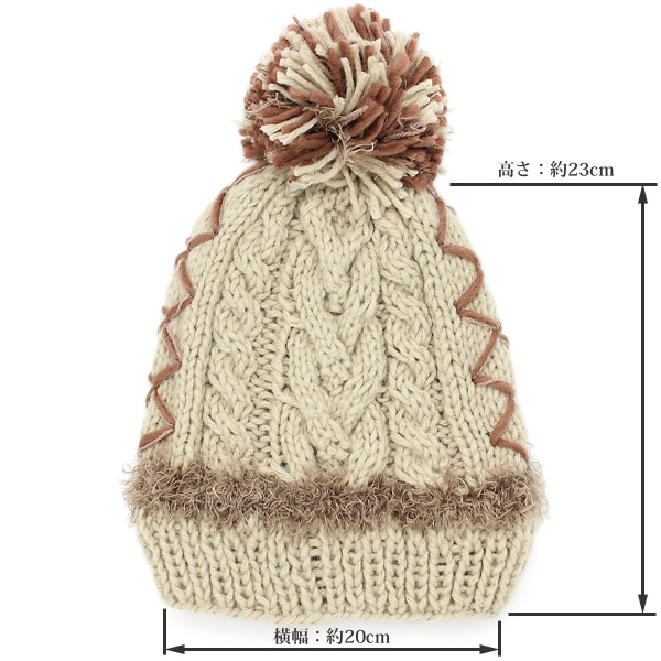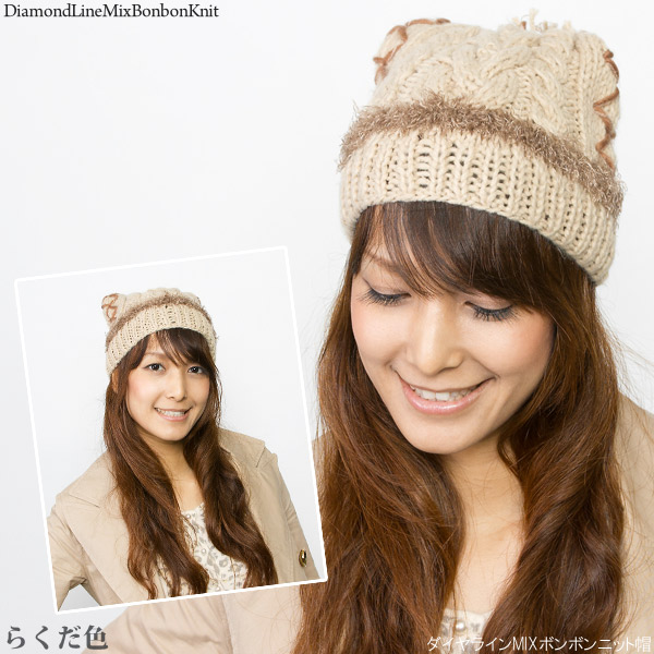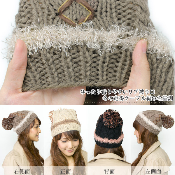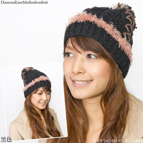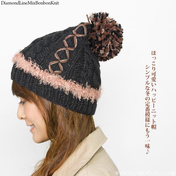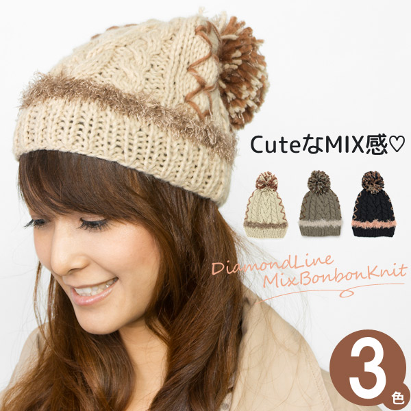 ニット帽 ボンボン [メール便可] 帽子 レディース 秋冬 ケーブル 防寒 / ダイヤラインMIXボンボンニット帽