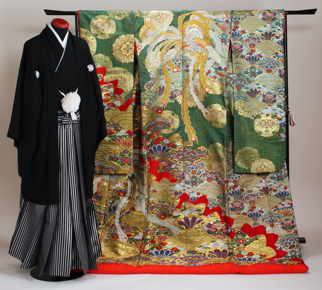 | 【 打掛 】 ■ 表地:高級打掛正絹100% ■ 裏地:正絹100% ■ 柄:正倉院雪輪取鳳凰文 ■ 色:緑金色 ■ 身長:145cm〜170cm位 ■ 洋服サイズ:5号〜17号位まで ※黒紋付・色紋付、各商品の詳細は、画像をクリックしてご確認ください。 ■ 身長:155cm〜185cm位 ■ サイズ:S〜4L ■ 胴回り:〜110cmまで ※家紋のご指定がある場合は、貼紋をご用意いたします。五つ紋5,500円にて承ります。 ※五つ紋は、羽織に付いております。 羽織とお着物両方に紋が必要な場合は11,000円にて承ります。 家紋の詳細を備考欄ご記入下さい。 サイズなどについて詳しくは「貸衣装ネット便」までお気軽にお問い合わせ下さい。 ●TEL:06-4307-3737 ●メール:dena-kashiisyou@bbhamada.com |