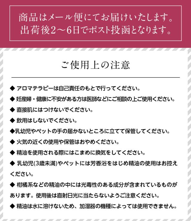 ■火気の近くの使用や保管はおやめください。■精油を使用される際にはこまめに換気をしてください。
