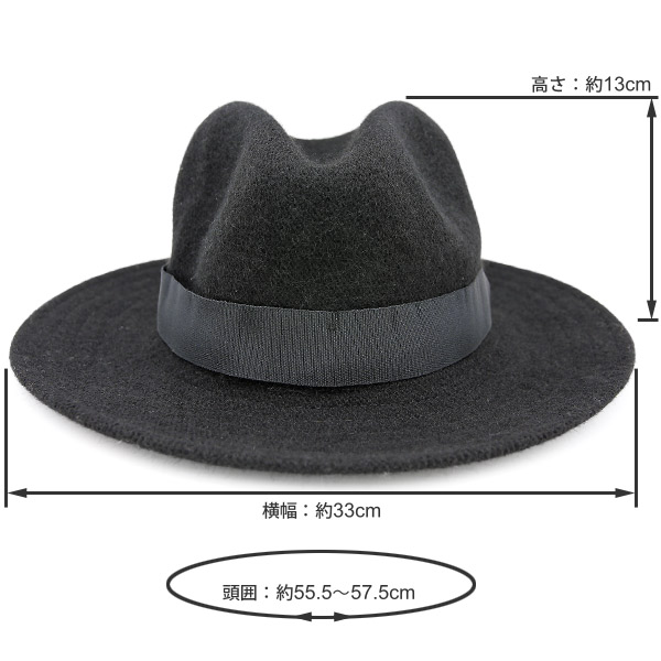 | サイズ | サイズ表記57.5cm(頭囲:約57.5cm、高さ:約13cm、横幅:約33cm[つばも含む]、つばの長さ:約7cm) |