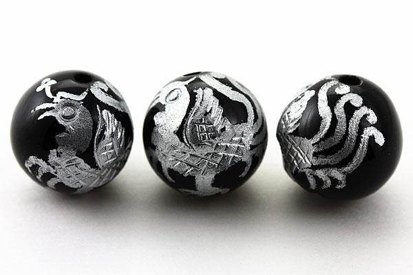 天然石 ビーズ【彫刻ビーズ】オニキス 10mm (銀彫り) 朱雀 パワーストーン