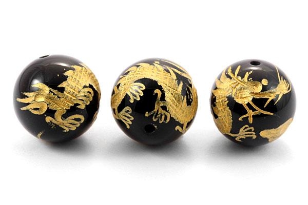 天然石 ビーズ【彫刻ビーズ】オニキス 16mm (金彫り) 青龍 パワーストーン