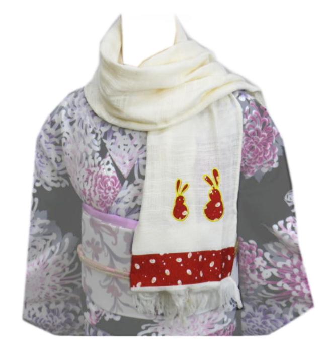 コットン マフラー 和柄 パッチワーク オフホワイト白色地うさぎ 着物 洋装 女性用 レディース ウサギ 兎