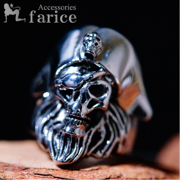 スカルアレンジ トリコーン(三角帽子)を被った眼帯&ロング顎髭パイレーツスカル(海賊)ブラック燻し調メンズステンレスリング