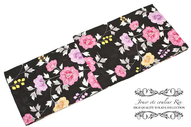レディース浴衣 花火大会 夏祭り 女性用 ブランド bonheur saisons(ボヌールセゾン) Jouer ete couleur 夏しぐれ 凛Rin 黒 ブラック カラフル 牡丹 綿 女性浴衣【フリーサイズ】