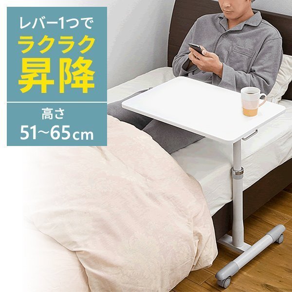 サイドテーブル ガス圧 高さ調整 51〜65cm ストッパー付きキャスター ホワイト ベッドサイド テーブル [100-DESK094W]