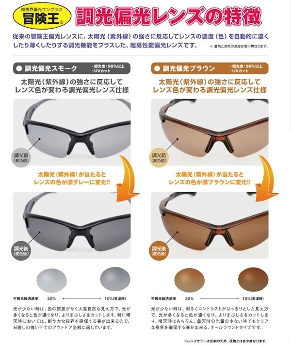 | 商品特徴 | 〇調光偏光レンズ 太陽光(紫外線)の強さに反応して、レンズの濃度(色)が変化。 調光機能をプラスした、超高性能偏光レンズです。 | |||