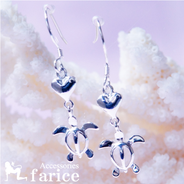 スターリングシルバー透かしホヌ(ウミガメ)&ハートデザイン ハワイアンジュエリー揺れる2連フックピアス