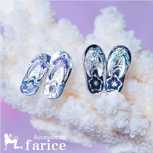 5ストーン アメジスト or ブルートパーズ プルメリア(花)&ヘリテイジスクロール(波) ビーチサンダルハワイアンジュエリーピアス