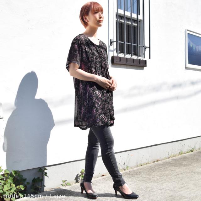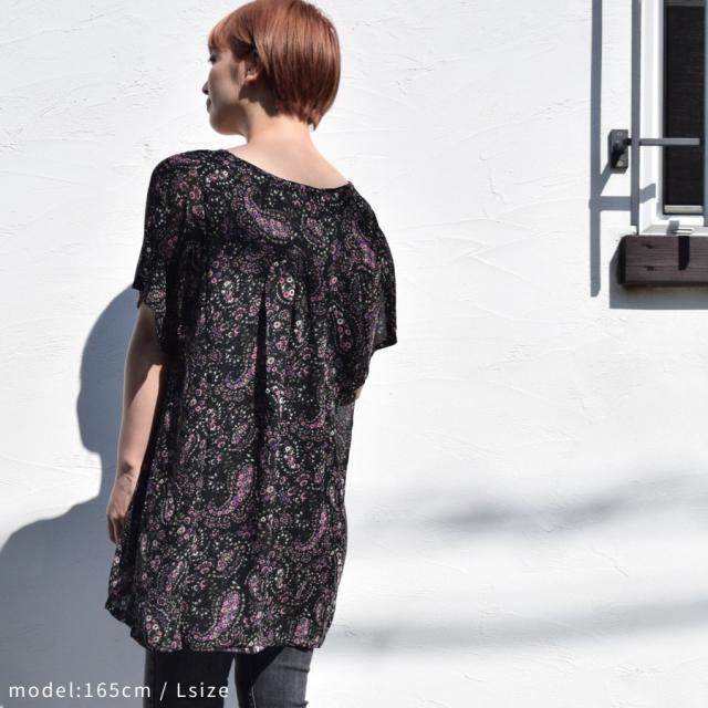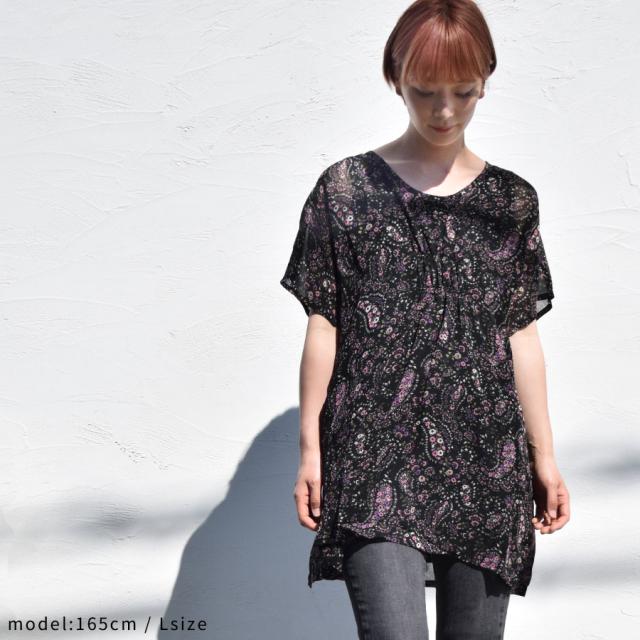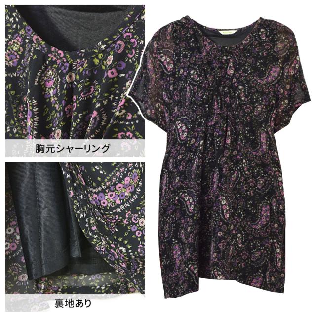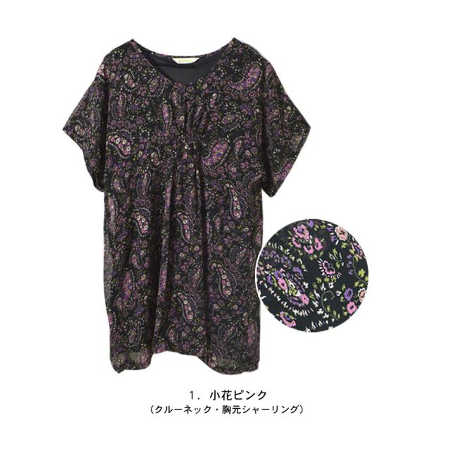 ワンピース チュニックワンピ シフォン レディース 花柄 小花柄 ペイズリー 総柄プリント マタニティ 五分袖 半袖 フレア袖 二の腕隠し 体系カバー 胸元シャーリング ギャザー ひざ丈 ミニ ミニワンピース フレア Aライン 送料無料 (han482)