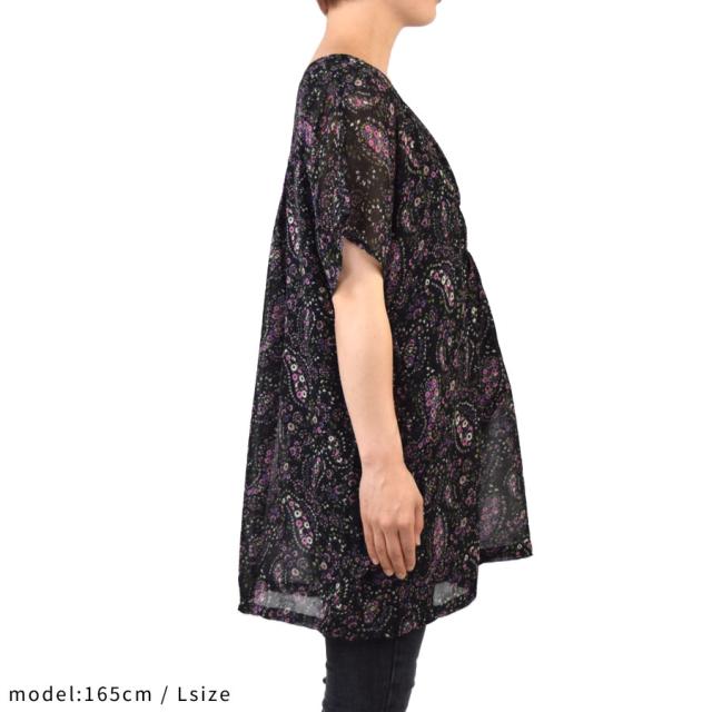 【ブラウス ワンピース チュニックワンピ レディース 花柄 小花柄 ペイズリー 総柄プリント マタニティ 五分袖 半袖 フレア袖 二の腕隠し 体系カバー 胸元シャーリング ギャザー シフォン ひざ丈 ミニ丈 ミニワンピース フレア Aラインシルエット ゆったり 大きいサイズ レトロ S M L LL サイズ】