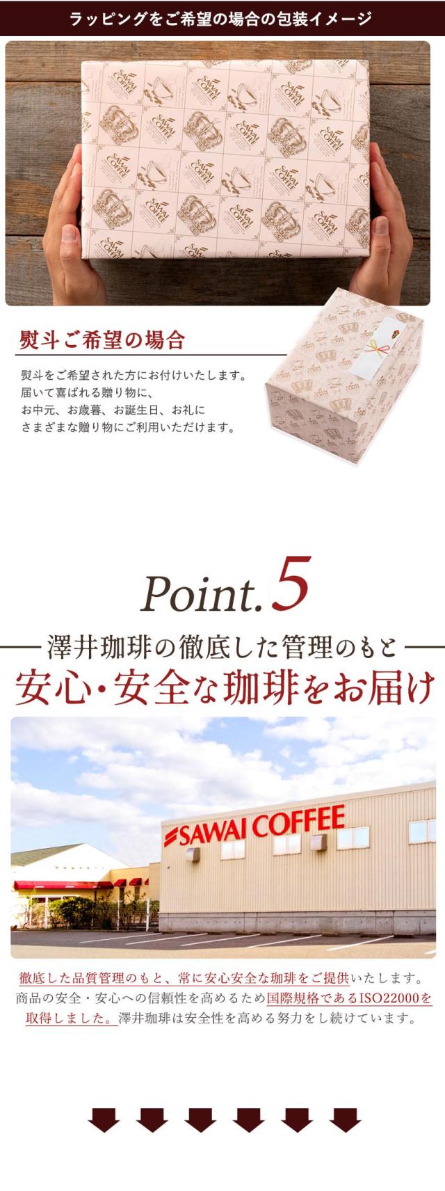 澤井珈琲(さわいこーひー)では、お客様のお家に商品が届き、箱を開けた瞬間。そして、トレードマークの赤いコーヒー袋の封を開けた時に鮮度抜群の「香り高さ」と、飲んだときの「味わい」に感動して頂けるように、レギュラーコーヒーはご注文を頂いてから焙煎をして焼きたてのコーヒー、コーヒー豆、珈琲、珈琲豆をお届けをしている焼き立て珈琲専門店です。お客様に「美味しい」と言って喜んで頂く事が私たちの喜びと思っております。「美味しいコーヒーをお届けしたい」と想い続けて生まれたこだわりの味を、どうぞ、この機会にお楽しみくださいませ。澤井珈琲では、コーヒー豆は挽き方がご選択いただけます。珈琲豆を挽く事をお楽しみ頂ける『豆のまま』や、私共の専用の特注サイズの大型のミルで挽いて、コーヒー粉の状態にしてお届けする方法がございます。中挽き、細挽き、粗挽き、荒挽きなど様々な挽き方がございますが、私共がお薦めする『店長のおすすめ挽き』にて、そのコーヒーに合った一番美味しいと思える挽き方に挽いてお届けします。東京の銀座にも実店舗を構える安心安全な澤井珈琲で楽しいお買い物をお楽しみください。よく間違えられる名前として、沢井珈琲、沢井コーヒー、澤井珈琲店、澤井珈琲本店、さわいこーひー、サワイコーヒーなどがございますが、正式名称は澤井珈琲となります。