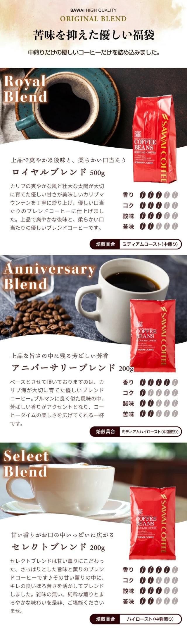 | 内容量 | ・ロイヤルブレンド500g×1袋 ・アニバーサリーブレンド200g×1袋 ・セレクトブレンド200g×1袋 |