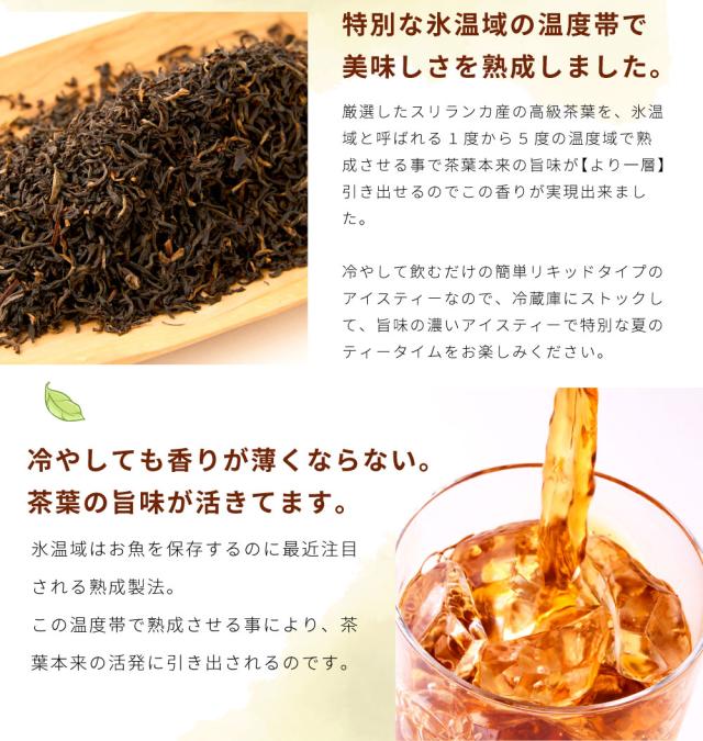 | 「甘熟紅茶オリジナルアイスティーリキッド」は、厳選されたスリランカ産の茶葉を、特別な氷温域で熟成させた濃厚な味わいのアイスティーです。冷蔵庫にストックしておくだけで、いつでも手軽に濃い旨味が楽しめるリキッドタイプ。無糖と加糖の2種類から選べて、特別な夏のティータイムを手軽に楽しめます。 1. 手軽に楽しめる濃厚なアイスティー このアイスティーは、リキッドタイプなので、冷蔵庫で冷やしておけば、いつでも簡単に美味しいアイスティーを楽しめます。特別な道具や手間は一切不要です。さらに、加糖と無糖の2種類から選べるので、お好みやシチュエーションに合わせて楽しむことができます。冷たい飲み物が欠かせない夏に、ストックしておくと重宝すること間違いなしです。特に暑い日でも手軽にリフレッシュできる一杯を楽しめるのが、この商品の大きな魅力です。 2. 特別な熟成製法で茶葉の旨味を最大限に引き出す このアイスティーの特徴は、茶葉の旨味を極限まで引き出すために、1度から5度の特別な氷温域で熟成されていることです。この製法により、紅茶の持つ本来の香りと味がより一層深くなり、冷やしてもその豊かな香りがしっかりと楽しめます。お魚の保存にも注目されるこの製法が、茶葉の美味しさを存分に引き出し、風味豊かで満足感のあるアイスティーを実現しています。 3. たっぷり楽しめる1000ml×6本の大容量セット 「甘熟紅茶オリジナルアイスティーリキッド」は、1000mlの大容量が6本セットになっています。これだけの量があれば、家族や友達とシェアしたり、何度も買い足す手間もなく、毎日のティータイムを楽しめます。しかも、送料無料なので、とてもお得です。夏場の飲み物として常備しておけば、いつでも気軽にリフレッシュでき、特別なティータイムを演出してくれるでしょう。 | |