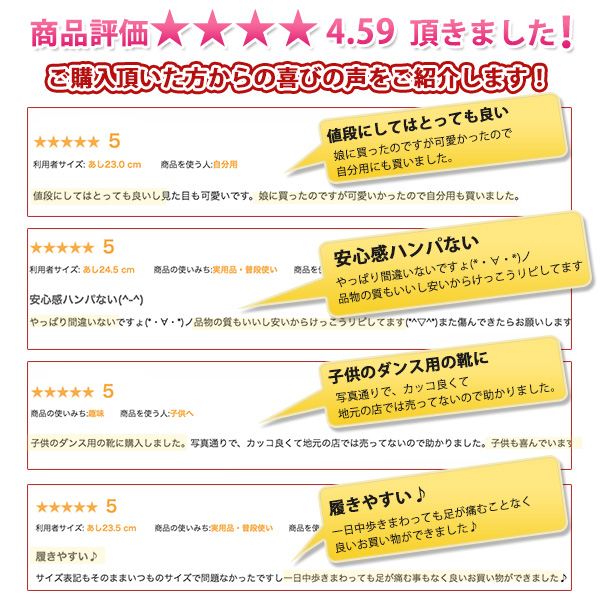 - たまには違う靴もいいなと思い、お手頃価格でこんなに可愛いい靴があると知り思わず購入致しました。耐久性に関してはまだ分かりませんが、満足しています。