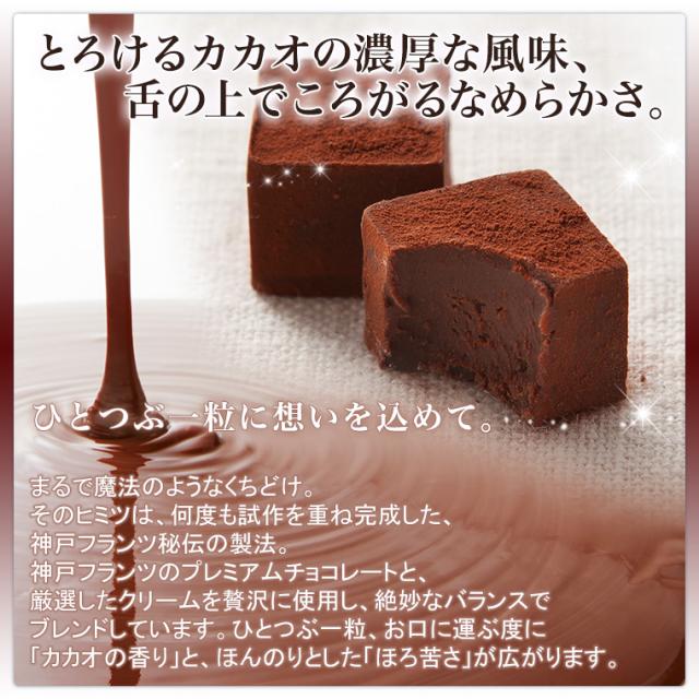 上質なクリームと神戸フランツオリジナルのプレミアムチョコレートを贅沢に使用し、秘伝の製法により仕上げた口溶けのよい生チョコレート。口の中でとろけるような濃厚な風味、舌の上でころがるようななめらかさ、そして、カカオの風味に絡まるほんのりしたほろ苦さが真骨頂。思わずもう1つと手がのびる、癖になる逸品です。