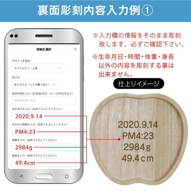 裏面には、「生年月日・時間・身長・体重」が彫刻できます。