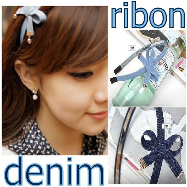 ビジュー付き★デニムリボンカチューシャ ヘアアクセサリー チャーム 髪留め 結婚式 パーティ イベント パーティ セレモニー