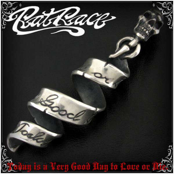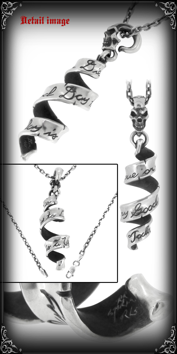 「Today is a very good day to love or die(愛し日和、死に日和)」の文字が刻まれた渦巻くリボンのシルバーネックレスです。