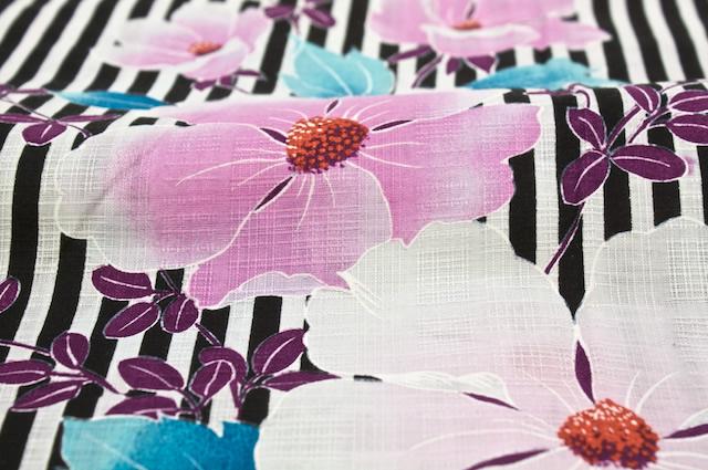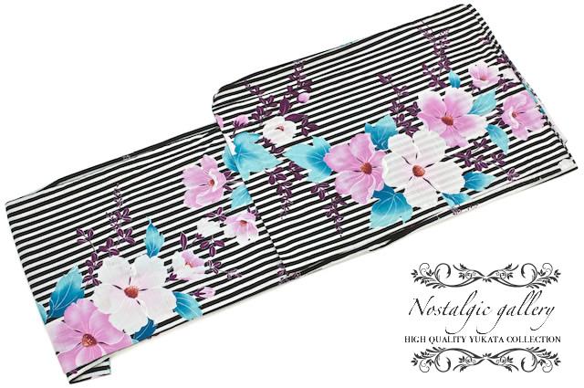 浴衣 レディース 女性用 縞 花柄 黒 ブラック 白 ホワイト ピンク 紫 パープル 花火大会 夏祭り bonheur saisons(ボヌールセゾン) Nostalgic Gallery 綿 【フリーサイズ】