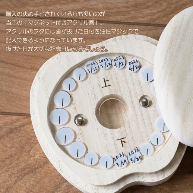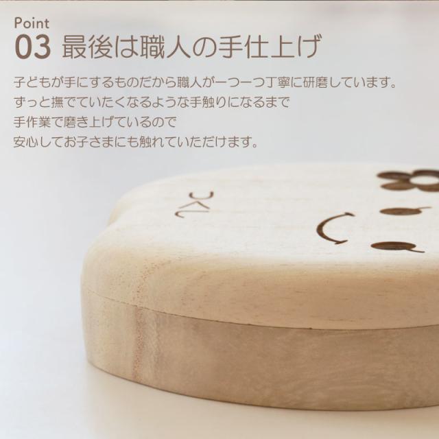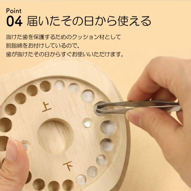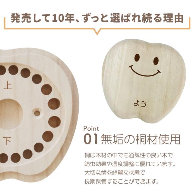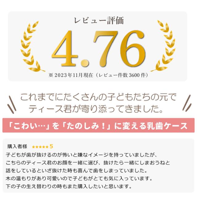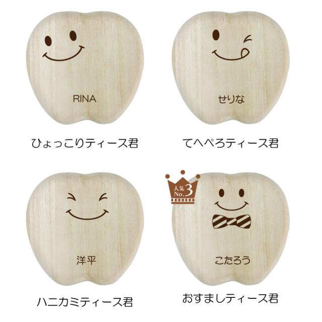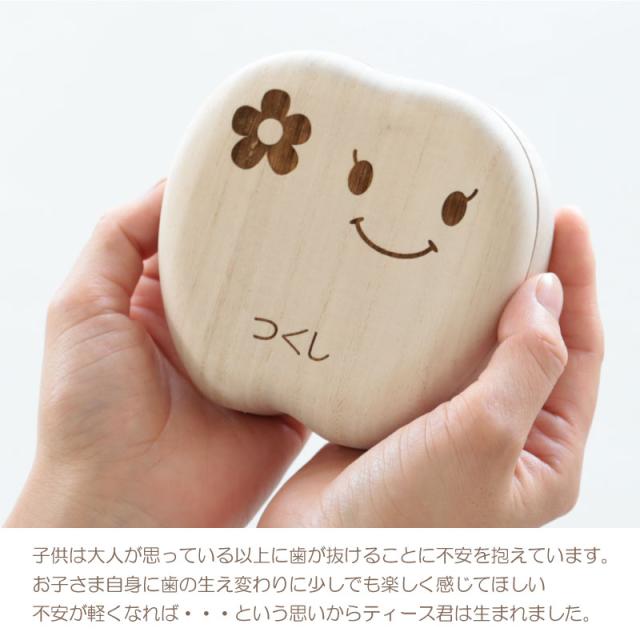 こどもの乳歯をかわいく保管 乳歯ケース ティース君 昔は一般的だった、抜けた歯を屋根上や床下に投げる習慣。 可愛いケースなら、大切な思い出もしっかり残せます。 だれもが経験する歯の生え変わり。 子供は基本的に痛みに弱く、大人が思っている以上に歯が抜けることに不安を抱えています。 こどもが喜ぶデザインにこだわったのは、 お子さま自身に歯の生え変わりに少しでも楽しく感じてほしい、不安が軽くなれば・・・という思いから。 いただいたお客様からのお褒めの言葉には “ 自分の選んだデザインと名前が入っていて子供は大喜び! ” “ 大事そうに歯を入れていました ” など、実際手に取ったお子さまに喜んでいただいています。 デザインは表情のバラエティ豊かな9種類! お子さまと楽しく選んでいただけます。 また、これからずっと保管していくものだからこそデザインだけでなく品質を追求しました。 素材はノンホルムアルデヒドのAランク桐材を使用。 通気性の良い桐材は腐食に強く防湿・抗菌効果など長期保管に最適の素材。 その桐材を職人が滑らかになるまで妥協を許さず丁寧に磨いています。 こどもが触るものだから、安心・安全にもこだわりました。 保管方法にも工夫を凝らしました。 マグネット付きのアクリルふたで、歯がこぼれ落ちることなく大切に保管していただけます。 “これはいつ抜けた歯?” “これはどこの歯?” なんてことが無いように日付が記入可能。また、抜けた歯の位置もわかる様、収納していただけます。 付属の脱脂綿を詰めてから入れていただくから、しっかりと固定可能。小さい歯でも安心です。 投げる場所がない、でも捨てられないとお悩みのマンションやアパートにお住まいの方にもおすすめです。 歯の生え変わりはこどもが成長したことを一段と感じることができる、人生の大切な1ページ。 デザイン・素材・製法にこだわり抜いた、他には無い乳歯ケースだから大切な思い出を残すのにぴったり。 名入れ可能でーつーつ木目や色が異なるから世界にただ一つだけ。 出産祝い・誕生日ギフトや孫の日ギフトにも自信を持っておすすめします! |