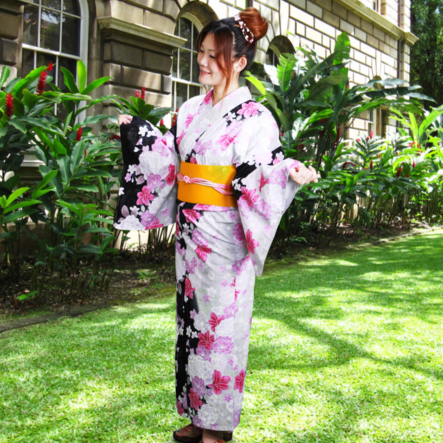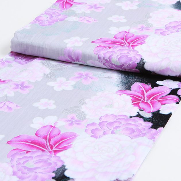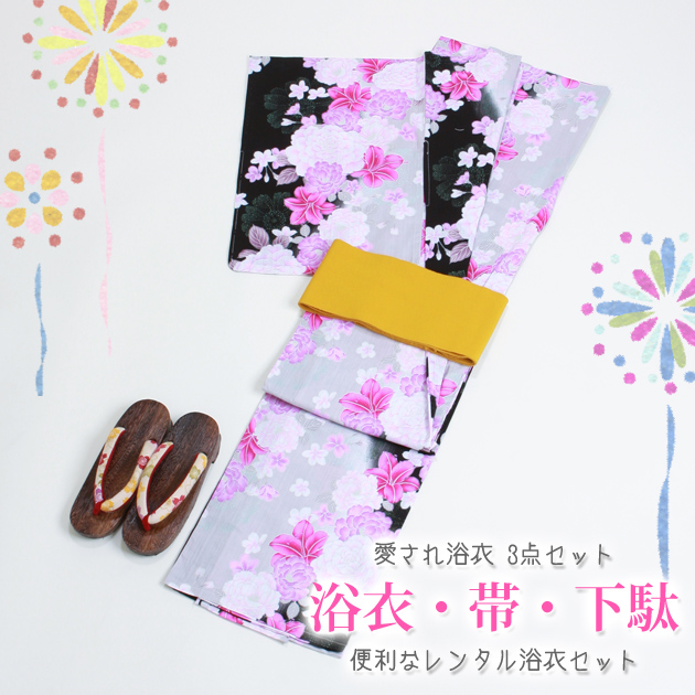 浴衣 レンタル NT-y038 浴衣3点セット☆浴衣・帯・下駄☆黒ピンク色/ゆり 花柄 愛され 送料無料