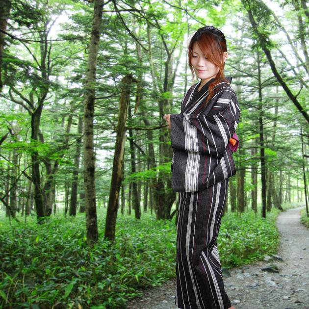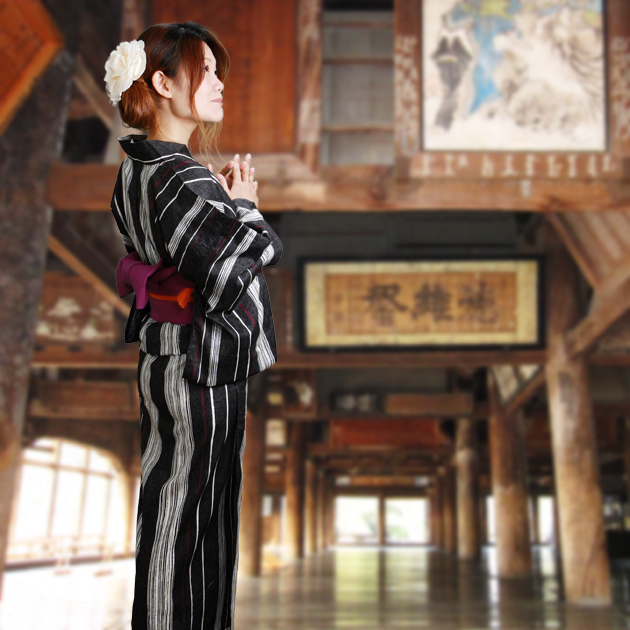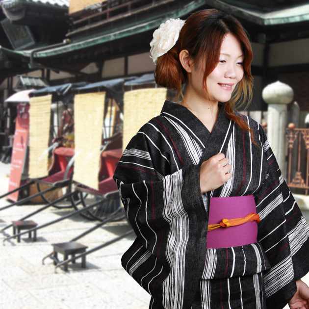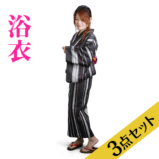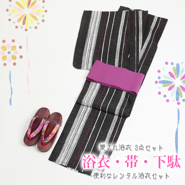 浴衣 レンタル NT-y044 浴衣3点セット☆浴衣・帯・下駄☆黒色/粋 縞 愛され 送料無料
