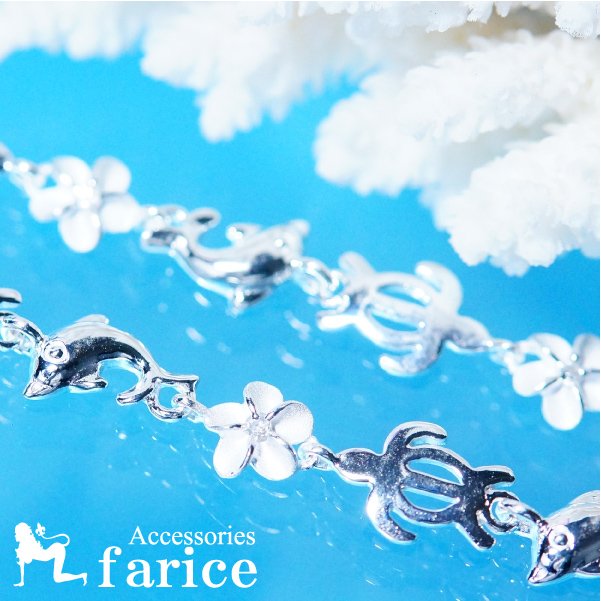 ハワイアンジュエリーで女性から絶大な支持を受けているプルメリア・ホヌ・ドルフィンの3モチーフをひとつにまとめたレディース・ハワイアンジュエリーブレスレットです。まずはプルメリアで花びら部分をホワイト仕上げにしているため白さがより際立ち手元で綺麗に映えてくれます。花の中心にはキュービックジルコニアが装飾されているので、動くたびに放たれるキラキラとした輝きがゴージャス感もプラスしています。次にホヌですが、こちらは人気の透かしプレート型になっており、カメの真ん丸ボディと短い手足&尻尾のフォルムは愛らしさ全開です。最後はドルフィンで、クルッと曲がった尻尾にふっくらボディのイルカがとってもキュートで可憐な雰囲気がさらにパワーアップされています。【幸せになれる伝説の花/プルメリア】【幸運を運ぶ海の守り神/ホヌ】【幸せを運ぶヴィーナスの使者/ドルフィン】がひとつになったとっても華やかでお得なレディース・ハワイアンジュエリー・シルバーブレスレットです