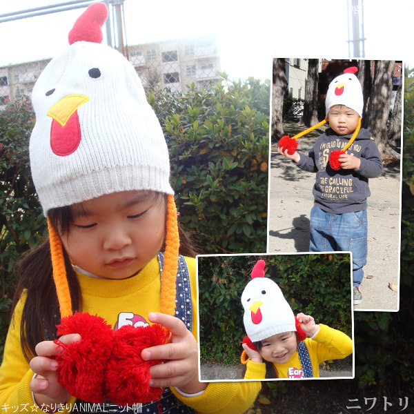 可愛い動物さんたちがおでこにお邪魔しまーす☆とっても可愛いなりきりニット帽です。つぶらな瞳の表情がたまらないですよね♪後側には動物さんに関係するアップリケがちょこんとついているし、おさげの先にはふかふかのまぁるいボンボンまで☆遊びココロ満点の楽しくお洒落できるアイテムです♪
