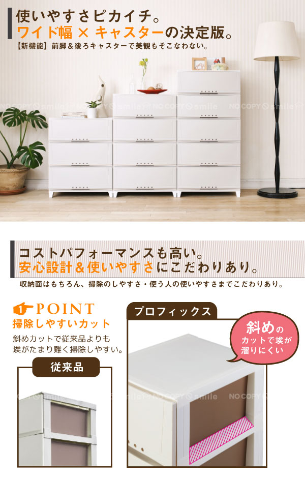 収納ケースとは思えないぐらいデザイン性の高いルックスのPROFIXからワイド幅キャスタータイプが登場!前脚はそのままに後ろのみにキャスターを取りつけることでお部屋の雰囲気も壊しません。他にも使う人が快適に出し入れ・管理できる工夫がいっぱい!!埃のつきにくいナナメカット、たわみを防ぎ強度を保つ天板アルミ構造で長く使える!スタッと閉まり、不用意な飛び出しを防ぐ引出セルフクローズ機構で安心。