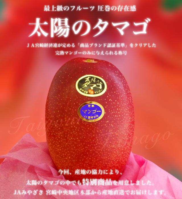 JA宮崎経済連が定める「商品ブランド認証基準」をクリアした完熟マンゴーのみに与えられる称号、全てを厳選した宮崎マンゴーのTOPブランド「太陽のタマゴ」をお届けします。