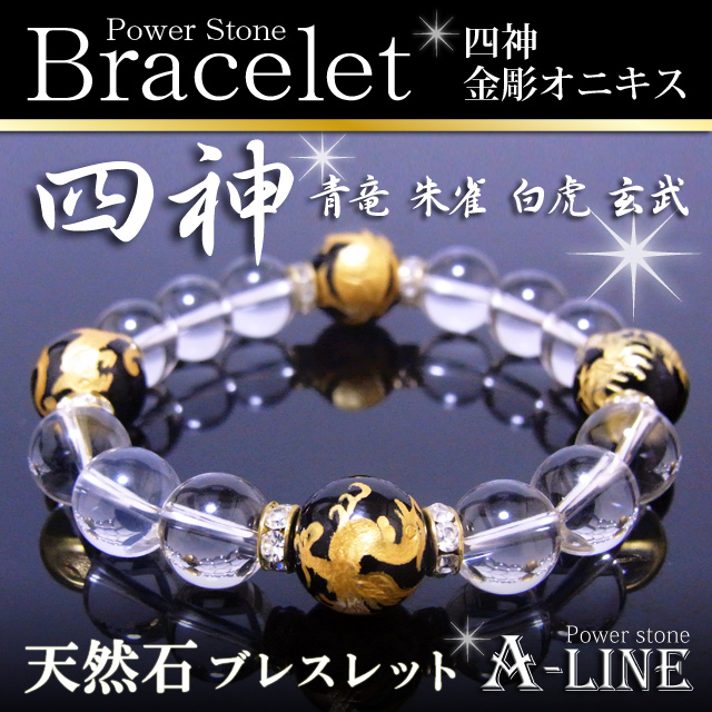 パワーストーン ブレスレット 四神金彫りオニキス12mm&水晶10mm 風水に PW-2536