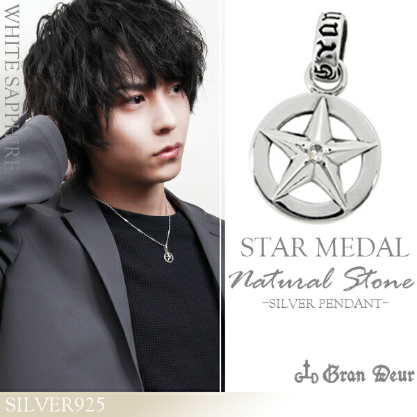 選べる2種類 スター メダル ペンダント (45cmチェーン) シルバー925 ブラックサファイア ホワイトサファイア 天然石 ネックレス 星 コイン 勲章