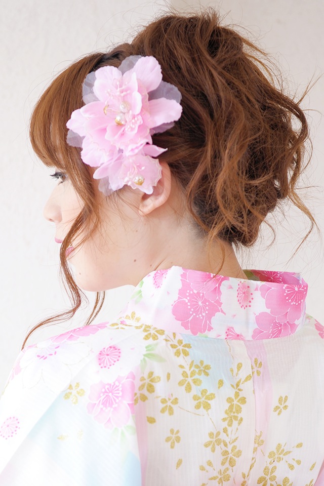 オーガンジーなどの異素材を何層にも重ねてふんわりと涼しげな髪飾りに仕上げました。