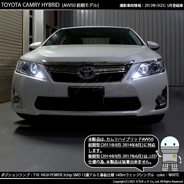 下記製品のポジションランプは カムリハイブリッドAVV50前期型(2011年9月-2014年8月)に 装着可能です。 後期型(2014年9月-2017年6月)は、LED仕様の為、装着出来ません。 超越した明るさと高品質を実現 ポジションランプ用LEDバルブ 400lm |