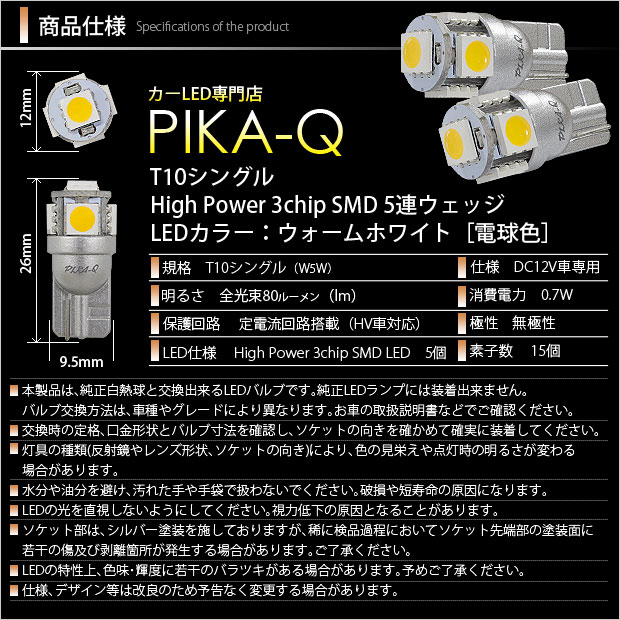 ポジションランプ用LEDバルブ T10 High Power 3chip SMD 5連ウェッジシングル球 LEDカラー:ウォームホワイト(電球色) 1セット2個入り | ||||