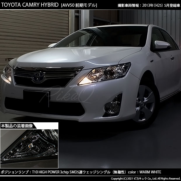 | ピカキュウ,LED専門店,LEDバルブ,LED,SMD,T10,W5W,T10 HIGH POWER 3CHIP SMD 5連ウェッジシングル球,ウォームホワイト(電球色),ポジションランプ,車幅灯,トヨタ,カムリハイブリッド,TOYOTA,CAMRY HYBRID,AVV50,前期 |