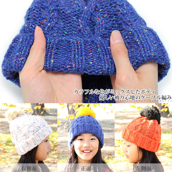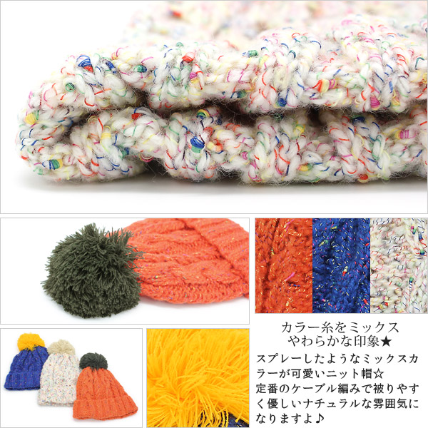 カラフルなカラー糸をミックスさせた、やわらかなケーブル編みのニット帽です。ほっこりあたたかくって、ふんわり包み込んでくれるちょうどいいサイズ感。TOPのふかふかのボンボリも軽くて被っていても重たくないので疲れません。 ぱっと目をひく可愛い色使いがポイントです♪