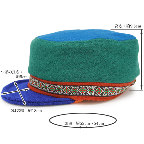 サイズ表記52〜54cm(頭囲:約52〜54cm[後部にゴムを使用]、高さ:約9.5cm、つば:長さ約5cm・幅約18cm)