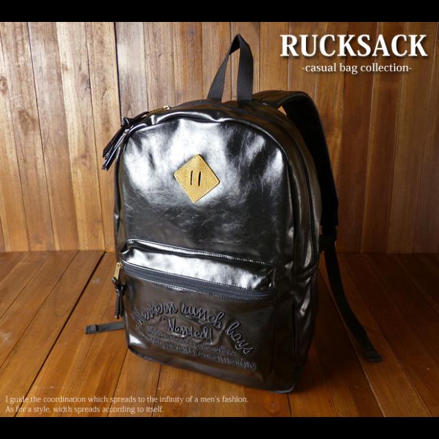 メンズ リュックサック デイパック 立体ロゴ刺繍 ワッペン装飾 合皮レザー