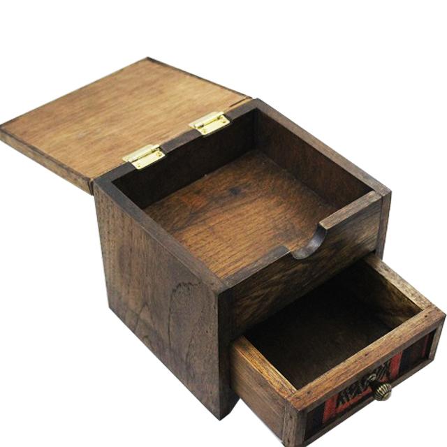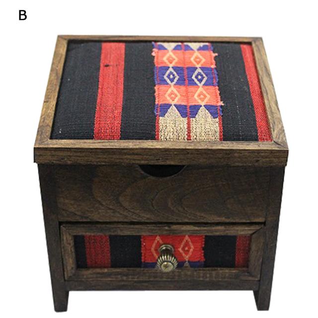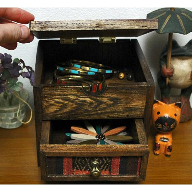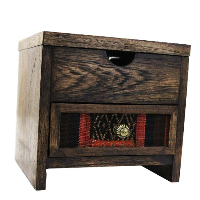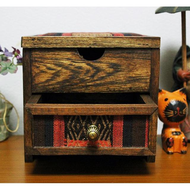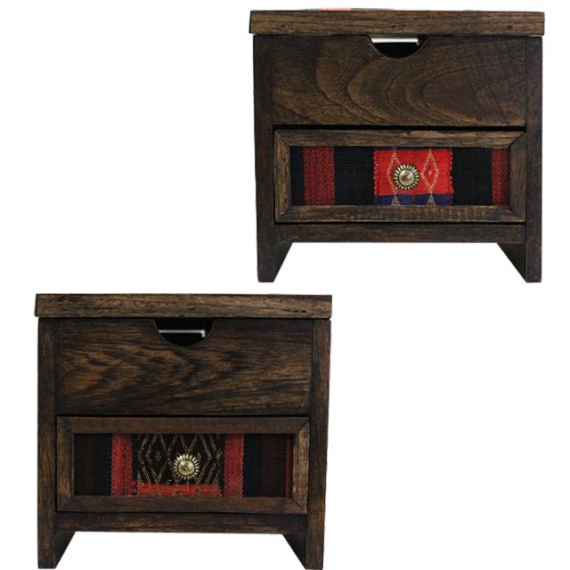 ナガ族生地 引き出しつき2段BOX【アジアン雑貨/エスニック雑貨/民芸品/民族織物/山岳民族刺繍/ミニチェスト/キャビネット/木箱】