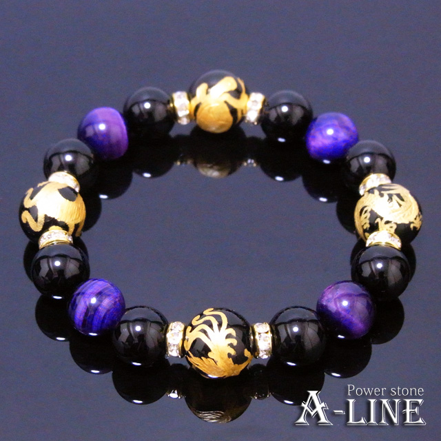 パワーストーン ブレスレット 四神金彫りオニキス12mm&AAAパープルタイガーアイ&オニキス10mm PW-2561