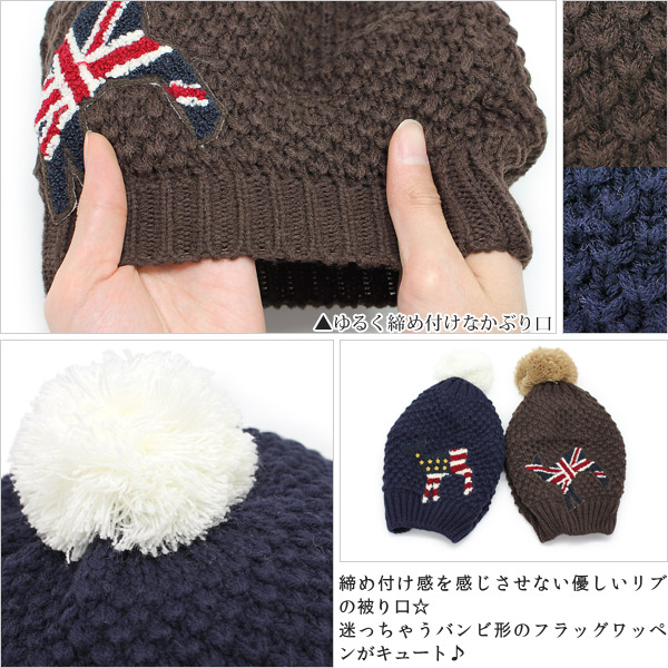 細かいハートのような編み目が可愛い表情のニットベレーです。被り口はゆるいリブのゴム編みで、締め付けのない優しいフィット感♪パイル状で立体感のあるサガラ刺繍のワッペンがこの帽子のポイント☆可愛すぎるバンビの形の配色は、それぞれ星条旗とユニオンフラッグの2パターン☆お好みでどうぞ♪