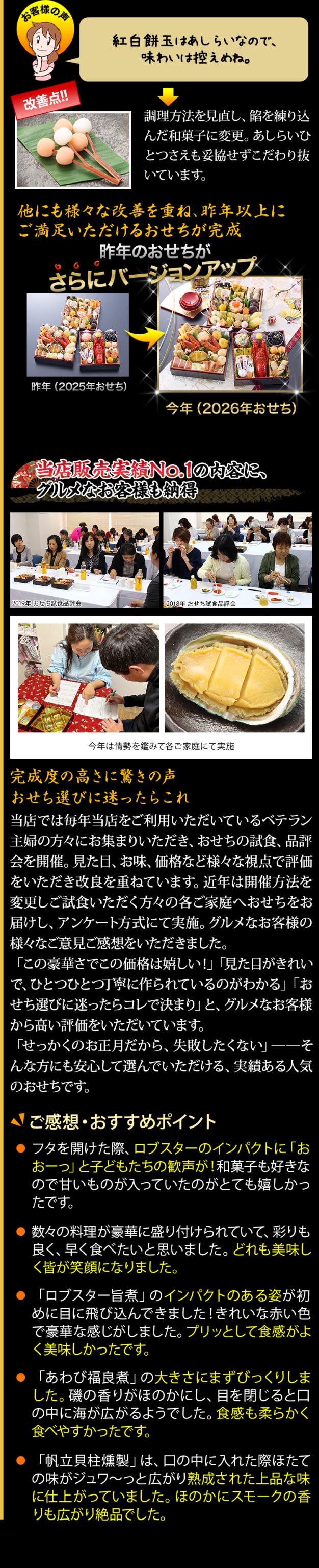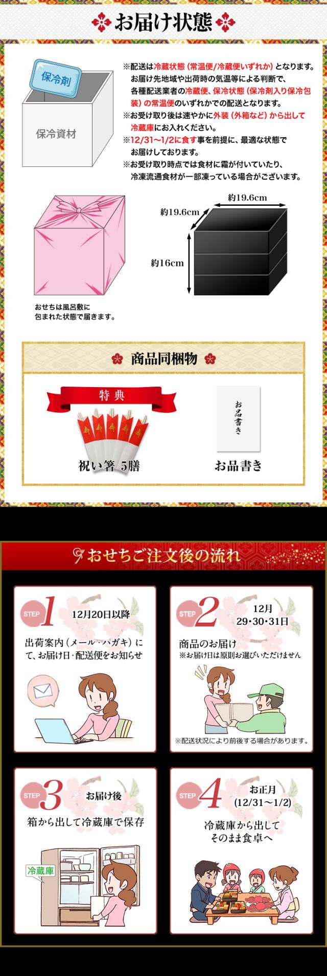 - 明けましておめでとうございます。無事12月30日に、おせち届きました。美味しく頂きました。また、機会が御座いましたらよろしくお願いします。ありがとう御座いました。