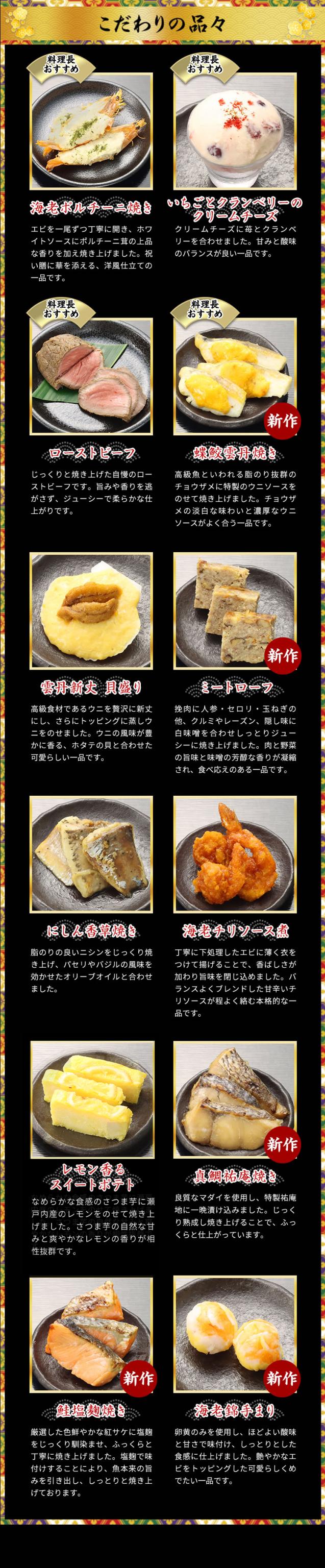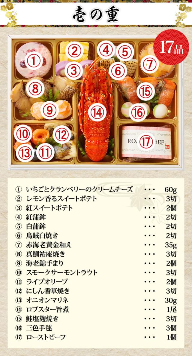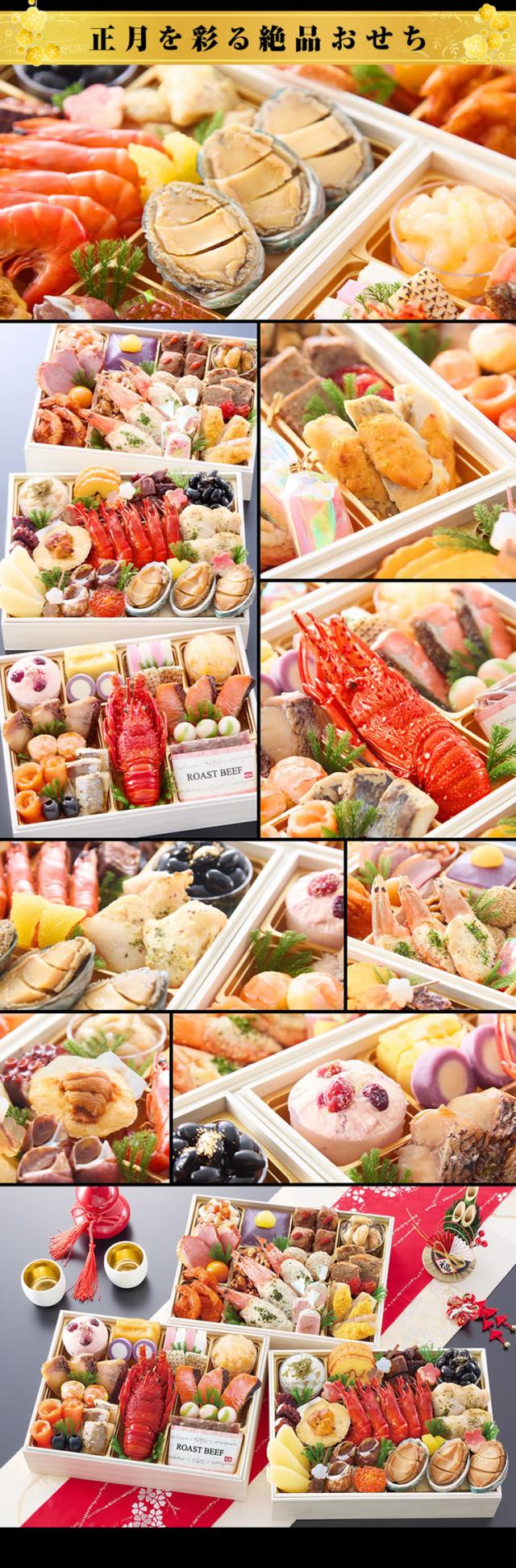 山の幸や海の幸など、和洋折衷のメニューを豊かに取り揃えました。毎年ご好評のロブスター、雲丹、ローストビーフなどの高級食材を始め、今年は更に食べ応えたっぷりな大きな「海老艶煮」を入れ、より充実した内容のおせちに仕上げております。また、「いちごとクランベリーのクリームチーズ」や「レモン香るスイートポテト」などの豪華なスイーツも盛り込み、女性やお子様にも楽しんでいただける内容になっております。