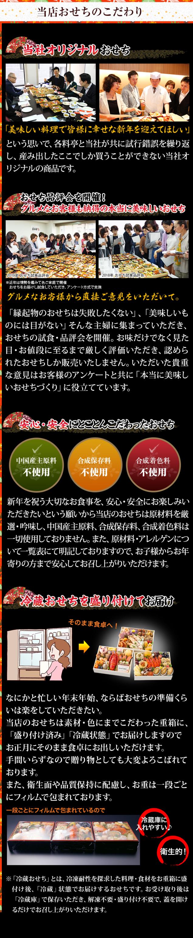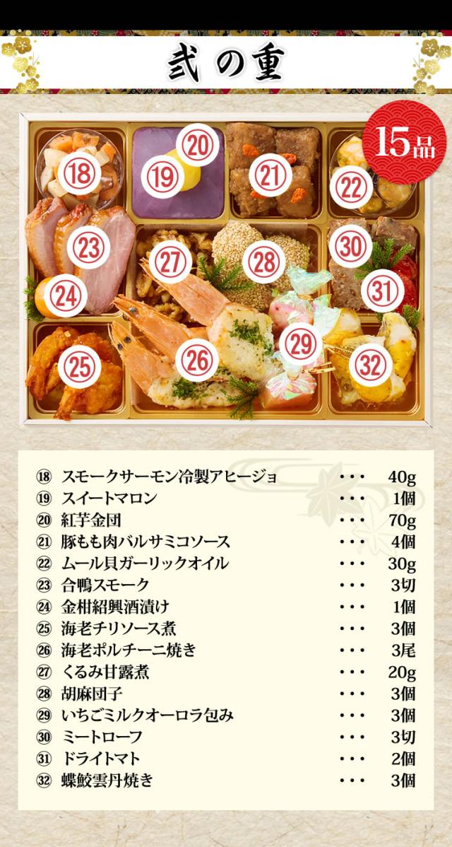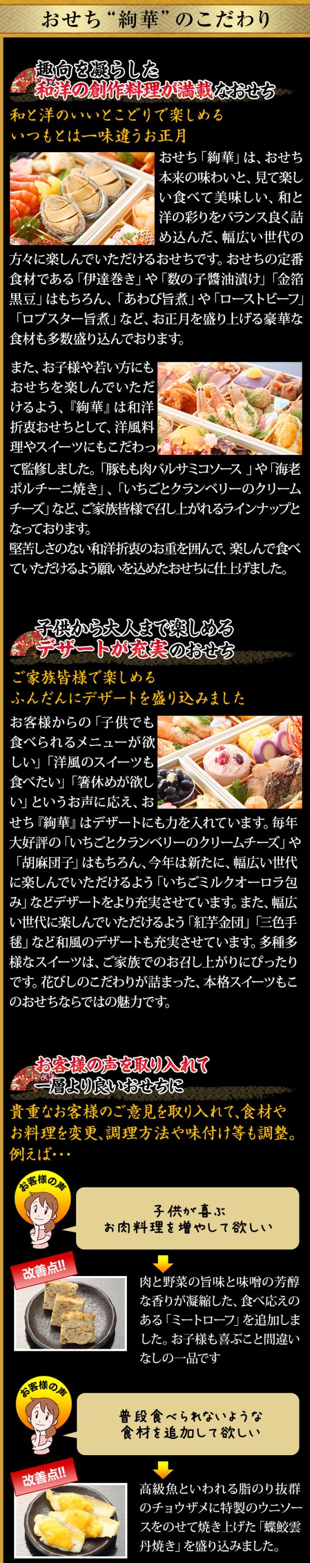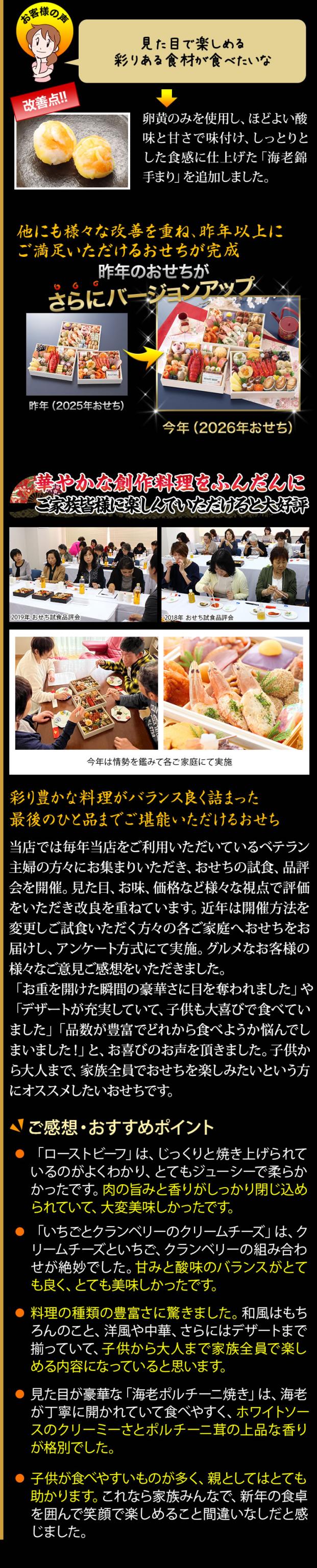 山の幸や海の幸など、和洋折衷のメニューを豊かに取り揃えました。毎年ご好評のロブスター、雲丹、ローストビーフなどの高級食材を始め、今年は更に食べ応えたっぷりな大きな「海老艶煮」を入れ、より充実した内容のおせちに仕上げております。また、「いちごとクランベリーのクリームチーズ」や「レモン香るスイートポテト」などの豪華なスイーツも盛り込み、女性やお子様にも楽しんでいただける内容になっております。