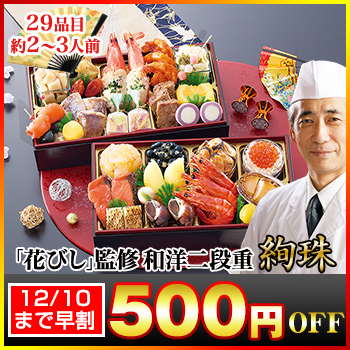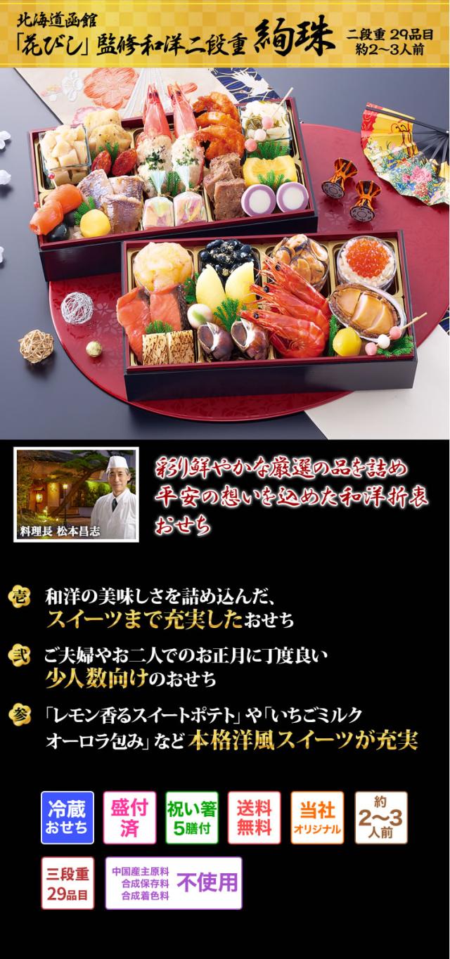 長方形二段和洋折衷おせち 【29品目・2〜3人前】 北海道函館「花びし」監修和洋二段重 絢珠 【送料無料】 冷蔵おせち 冷蔵 おせち お節 御節